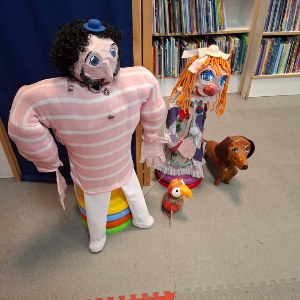 Učenici 1.b razreda upoznali su klaunesu i snagatora koji, zajedno sa svojim ljubimcima – papigom i psićem – žele promijeniti život kakav im drugi nameću. Rješenje pronalaze upravo u knjižnici, mjestu opuštenosti, veselja i kreativnosti. Nakon čitanja priče učenici su izrađivali straničnike.