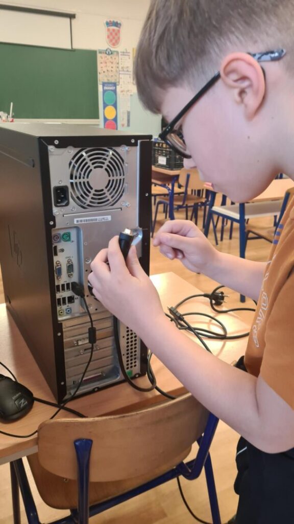 Tijekom sata učili su prepoznati različite vrste kablova i njihovu svrhu. Razgovarali smo o tome koji kabel služi za napajanje računala, koji povezuje monitor, a koji tipkovnicu i miš. Nakon kratkog objašnjenja učenici su preuzeli ulogu pravih malih tehničara te su s velikim zanimanjem i pažnjom spajali dijelove računala.